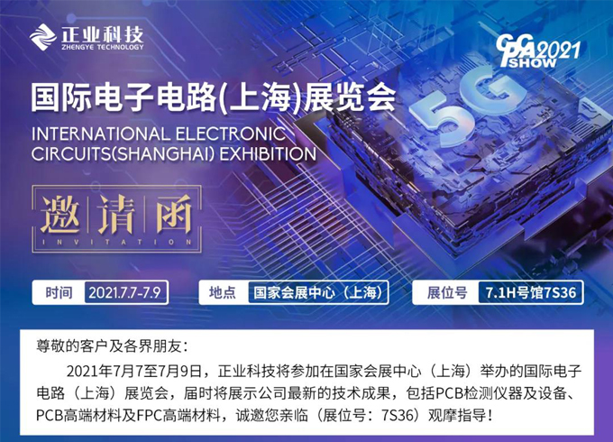 2021年7月7至7月9日,正業(yè)科技將參加在國(guó)家會(huì)展中心(上海)舉辦的國(guó)際電子電路(上海)展覽會(huì),屆時(shí)將展示公司最新的技術(shù)成果,包括PCB檢測(cè)儀器及設(shè)備、PCB高端材料及FPC高端材料,誠(chéng)邀您親臨(展位號(hào):7S36)觀摩指導(dǎo)!