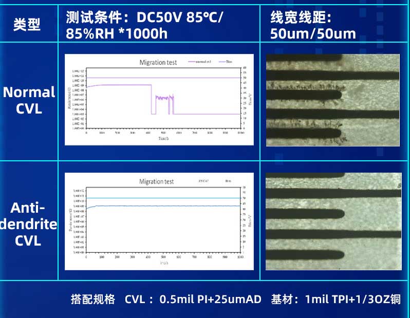 提高PCB基材的耐離子遷移性成為了電子產品開發中的迫切需求。因此,對于精細線路制程工藝,與之匹配的抗枝晶(Anti-dendrite)材料就顯得十分必要。抗枝晶(Anti-dendrite)材料的使用,能有效降低細線路間產生枝晶的風險,提高FPC的可靠性。